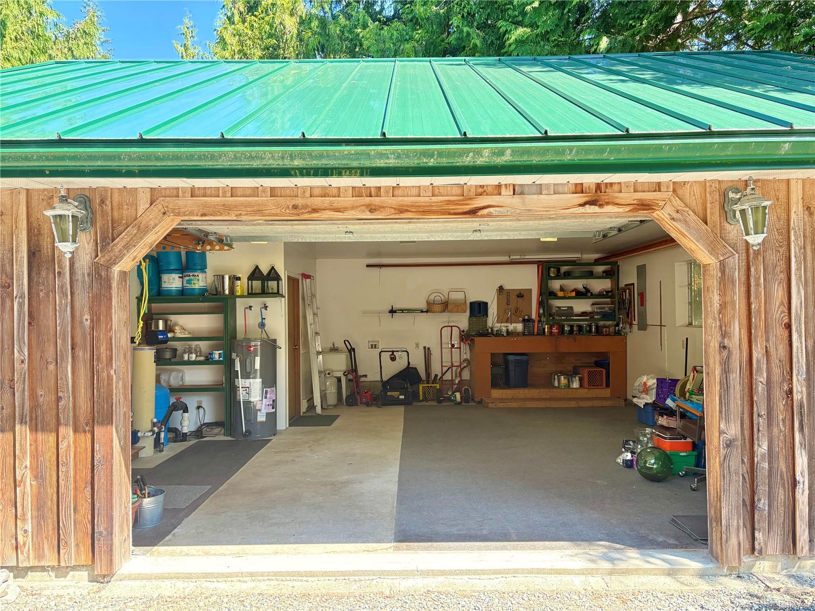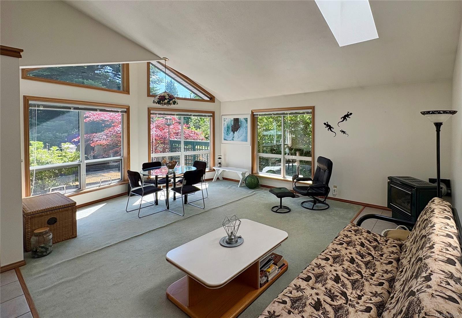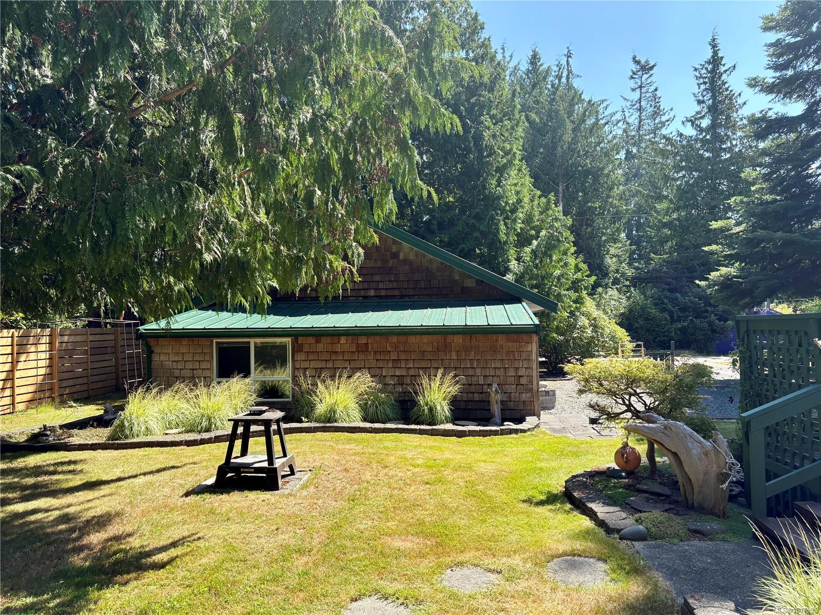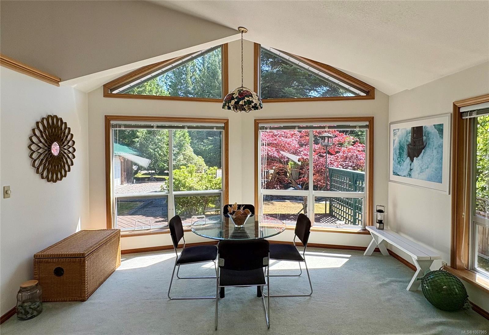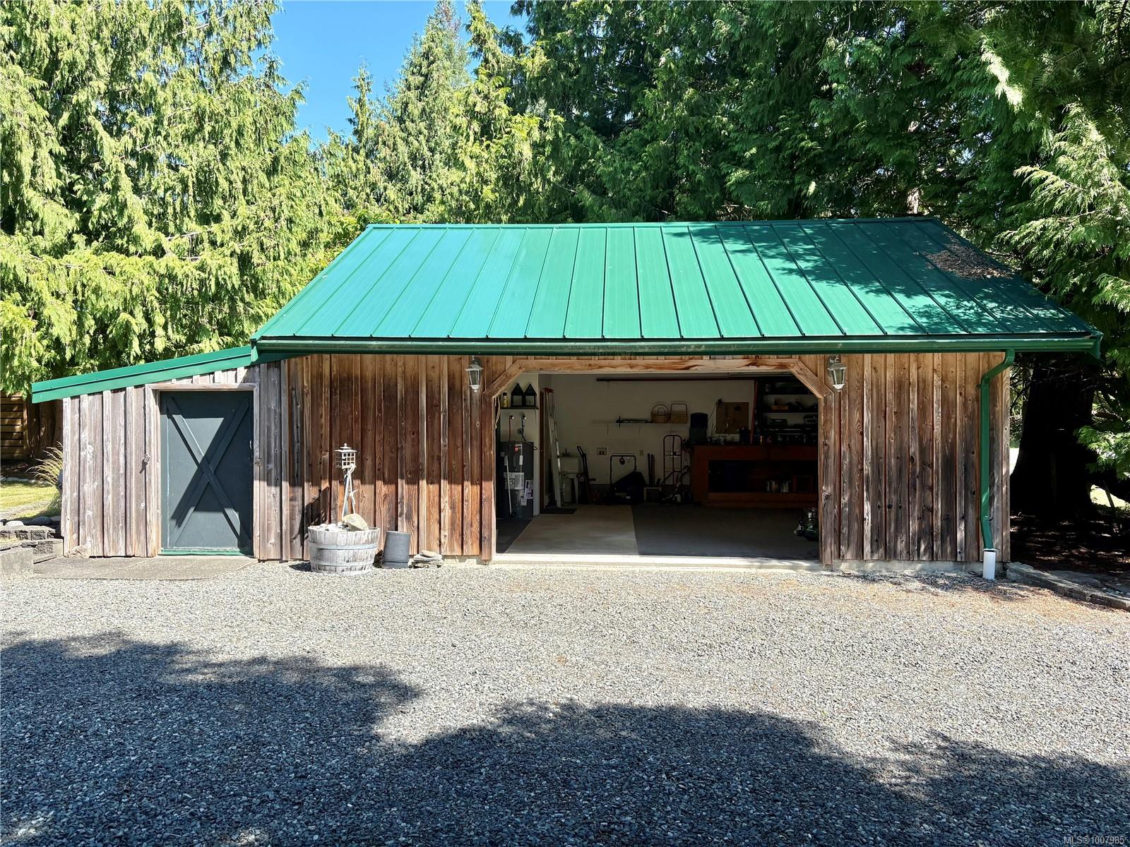 Welcome to this peaceful 2-bedroom, 1-bath home offering over 1000 sqft of charm and comfort, just moments from the sandy shores of Fillongley Provincial Park. This half-acre lot feels like a private sanctuary, with towering Douglas fir, cedar, and spruce sheltering the back garden, plus a seasonal creek and pond that meander through the woods invite birdsong and quiet reflection throughout parts of the year. Step inside the home where you are greeted with vaulted ceilings, large windows, and skylights flooding the open-concept living space with natural light—perfect for family gatherings or cozy evenings in with the propane fireplace tucked into one corner of the main living area. The two bedrooms are quietly tucked at the back, separated by a shared bath for added privacy. A newly roofed detached garage adds even more flexibility, with a guest room or storage space, bathroom, storage and 2 brand new water heaters add to the flexibility and comfort of this property. Laundry hook-ups are available in the garage. A place to unwind, connect, and breathe—whether full-time or just escaping for the weekend, you’ll feel right at home in this quiet and caring Denman Island neighborhood.